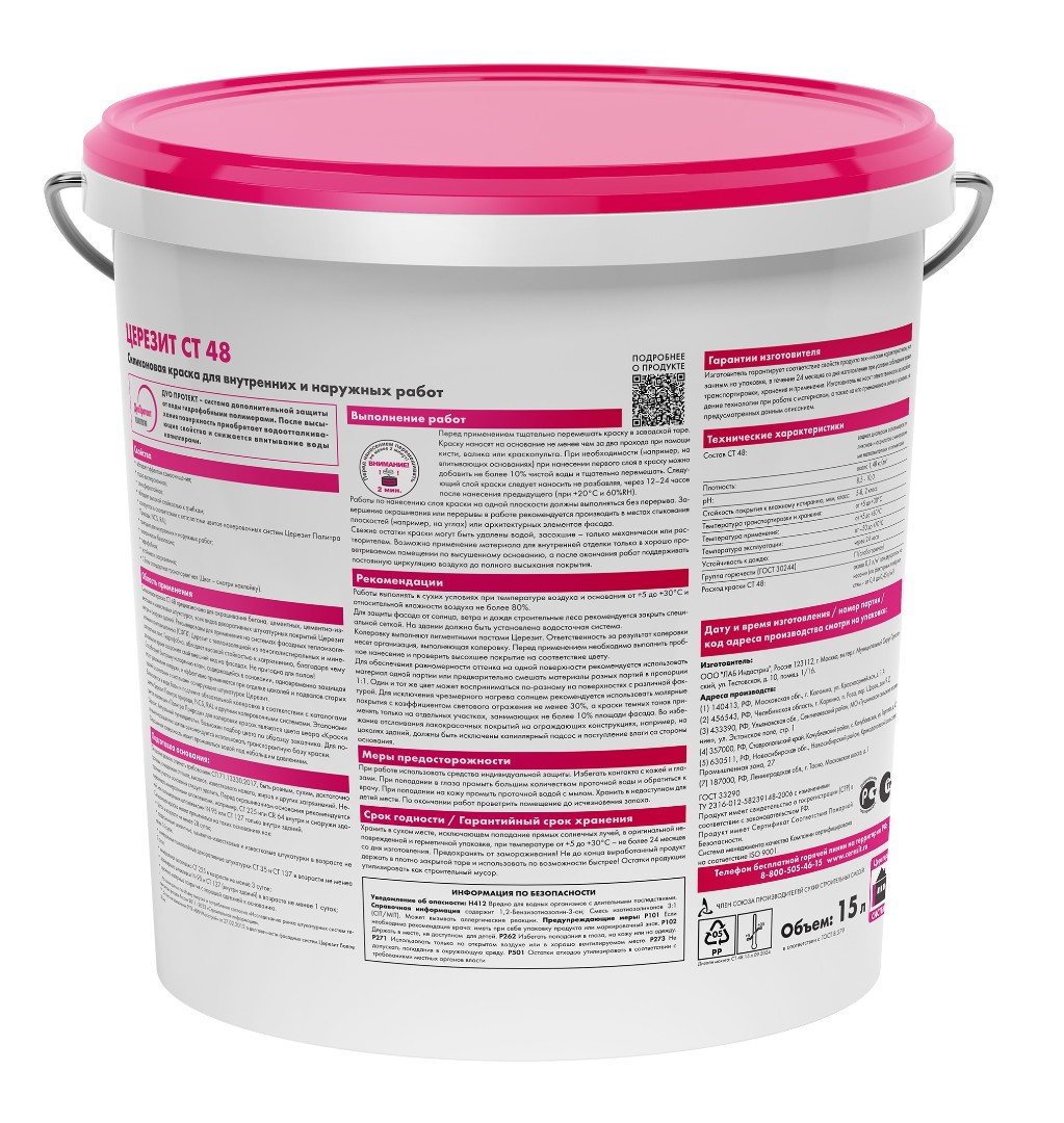 Описание товара: "Краска силиконовая Ceresit СТ 48 водно-дисперсионная транспарентная база (15л)"