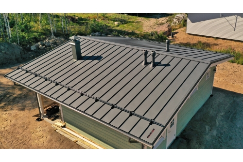 Главная особенность этого материала – легкость монтажа. Листы крепятся к обрешетке саморезами через отверстия вдоль замочной части кровли без использования специального оборудования.
