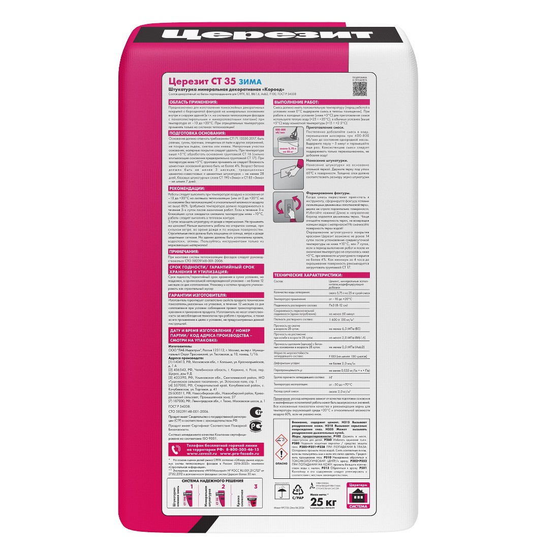 CT 35 – это марка качественной штукатурной смеси, разработанной для создания декоративных тонкослойных покрытий. Отделка имеет бороздчатую фактуру. Эта штукатурка используется при работе на цементных, бетонных, гипсовых, древесностружечных и гипсокартонных основаниях. Применяется, как покрытие внутри и снаружи строений и рекомендована при устройстве теплоизоляционных систем Ceresit VWS и Ceresit WM. Обеспечивает прочное сцепление с минераловатными и пенополистирольными плитами.