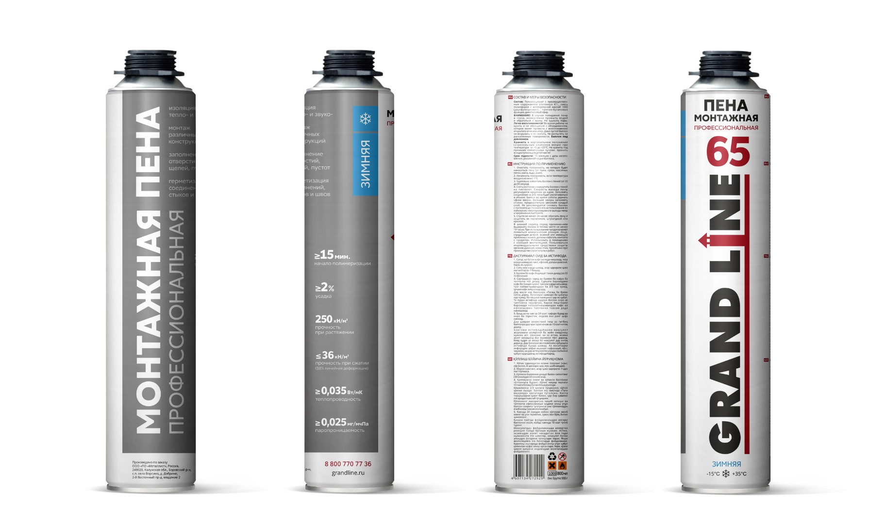 Пена монтажная профессиональная Grand Line зимняя поставляется в металлических баллонах по 1000 мл (16 шт в упаковке).