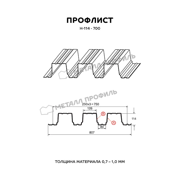 Профлист МЕТАЛЛ ПРОФИЛЬ Н-114x750-A (ОЦ-01-БЦ-0,9) широко применяется для обустройства профилированного листа. Изначально он представляет собой лист оцинкованной стали с покрытием. Общая толщина стальной основы с оцинковкой и декоративно-защитным слоем составляет 0.9 мм. После проката на специальном оборудовании сталь принимает волнообразный вид. Такая конфигурация придает профилю жёсткость.